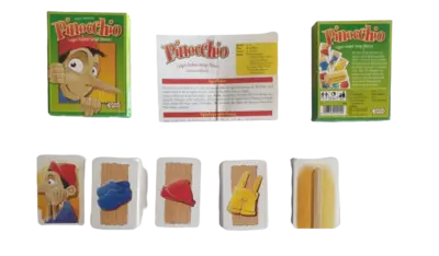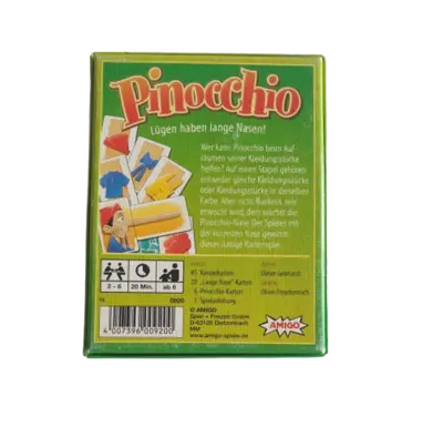 Wer kann Pinocchio beim Aufräumen seiner Kleidungsstücke helfen? Auf einen Stapel gehören entweder gleiche Kleidungsstücke oder Kleidungsstücke in derselben Farbe. Aber nicht flunkern, wer erwischt wird, dem wächst die Pinocchio-Nase. Der Spieler mit der kürzesten Nase gewinnt dieses lustige Kartenspiel.
