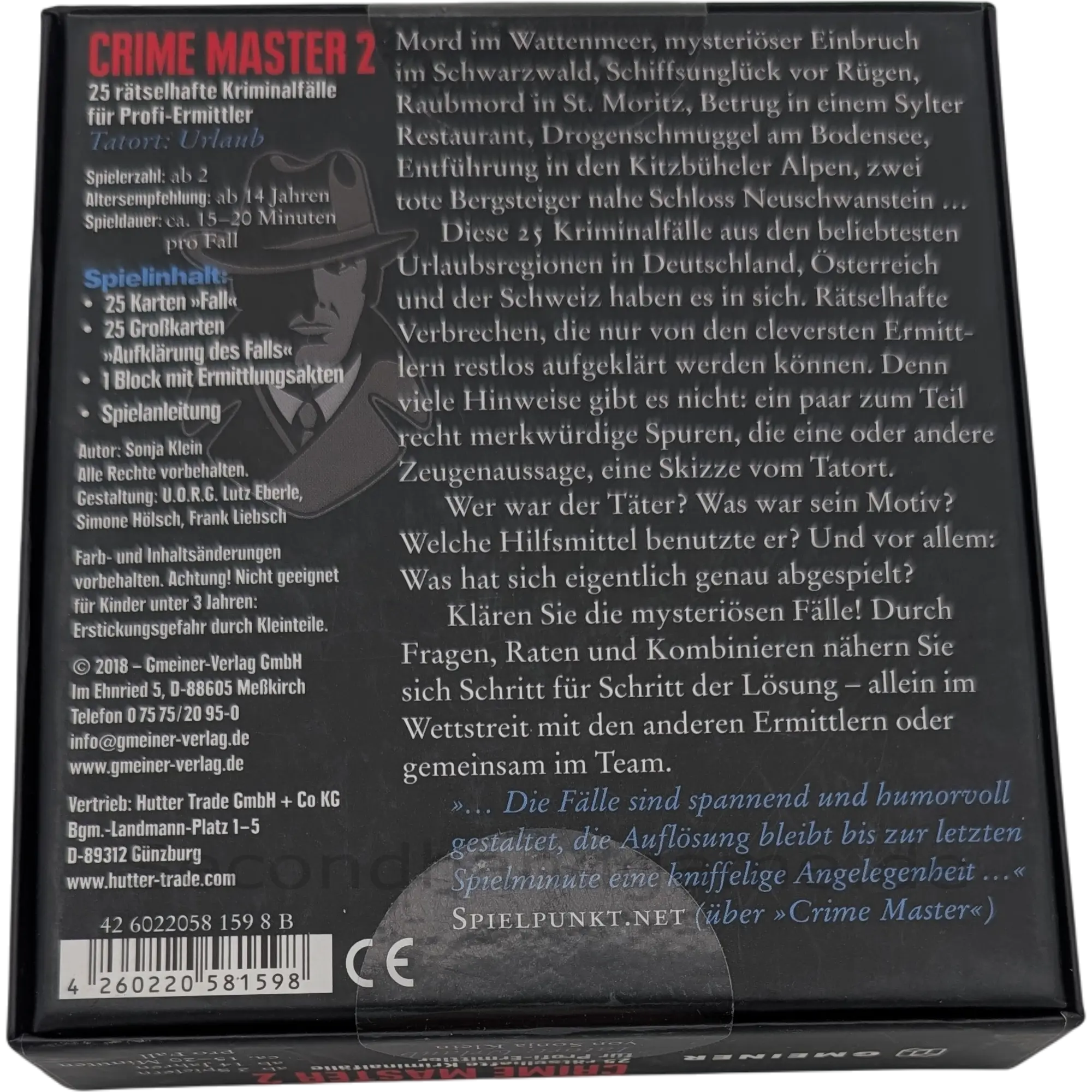 Beschreibung: "Crime Master 2 – Tatort: Urlaub" (EAN 4260220581598) von Sonja Klein versetzt Sie in die Rolle von Profi-Ermittlern in den schönsten Urlaubsregionen. 25 rätselhafte Kriminalfälle an Orten von der Ostsee bis zu den Alpen warten darauf, gelöst zu werden. Nur mit spärlichen Hinweisen, einigen Zeugenaussagen und einer Tatortskizze müssen Sie durch geschicktes Fragen und Kombinieren die exakt 12 richtigen Antworten zu Täter, Motiv und Tathergang finden. Ob als spannendes Partyspiel oder im Team-Duell: Dieses kompakte Krimi-Kartenspiel ist ideal für Rätselfreunde und für unterhaltsame Abende.