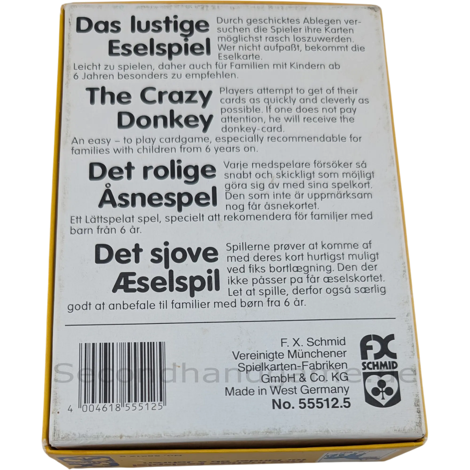 Durch geschicktes Ablegen versuchen die Spieler ihre Karten möglichst rasch loszuwerden. Wer nicht aufpaßt, bekommt die Eselkarte. Leicht zu spielen!