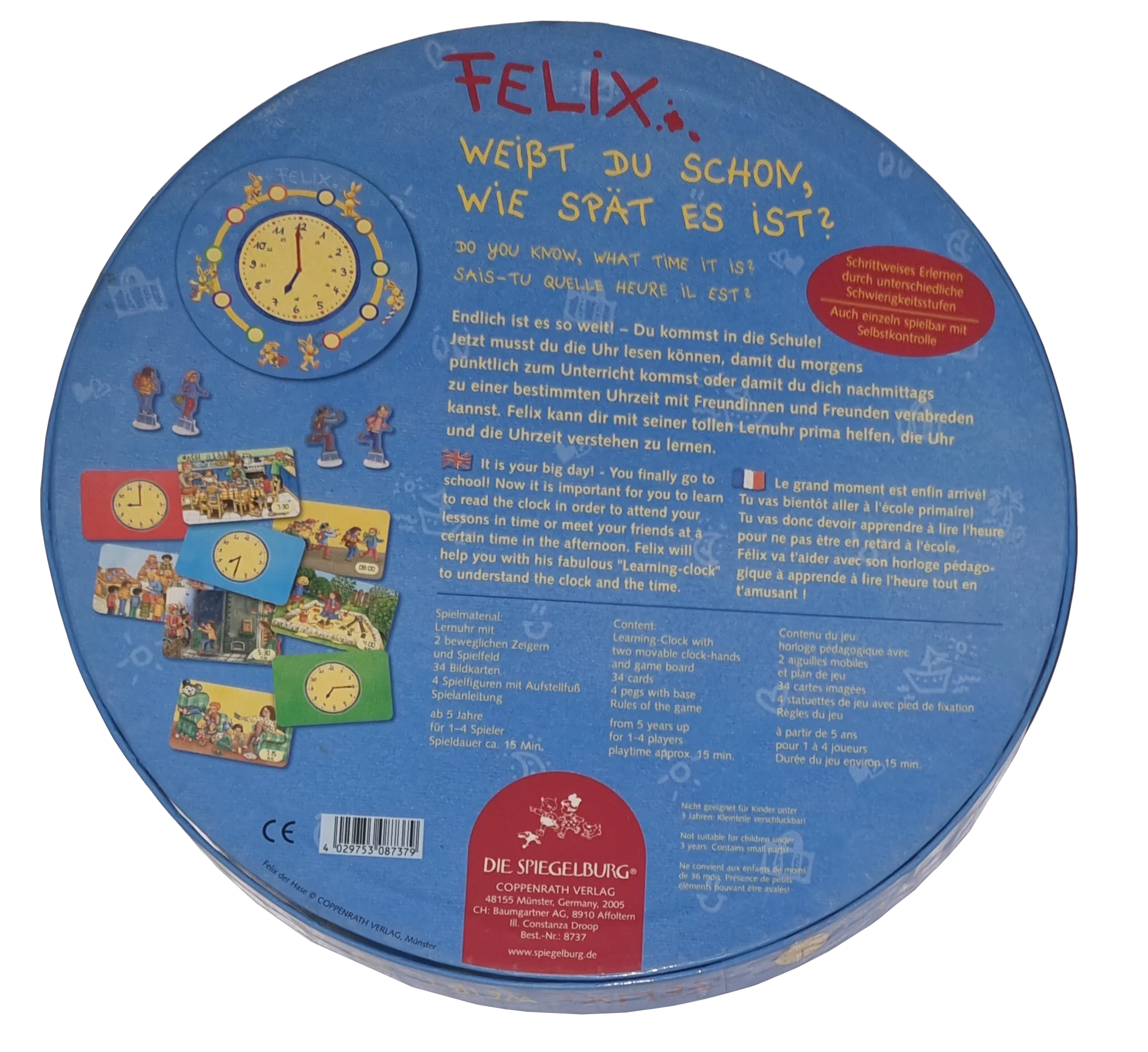 Ein schönes Spiel um die Uhrzeiten zu erlenen und um darin sicherer zu werden!