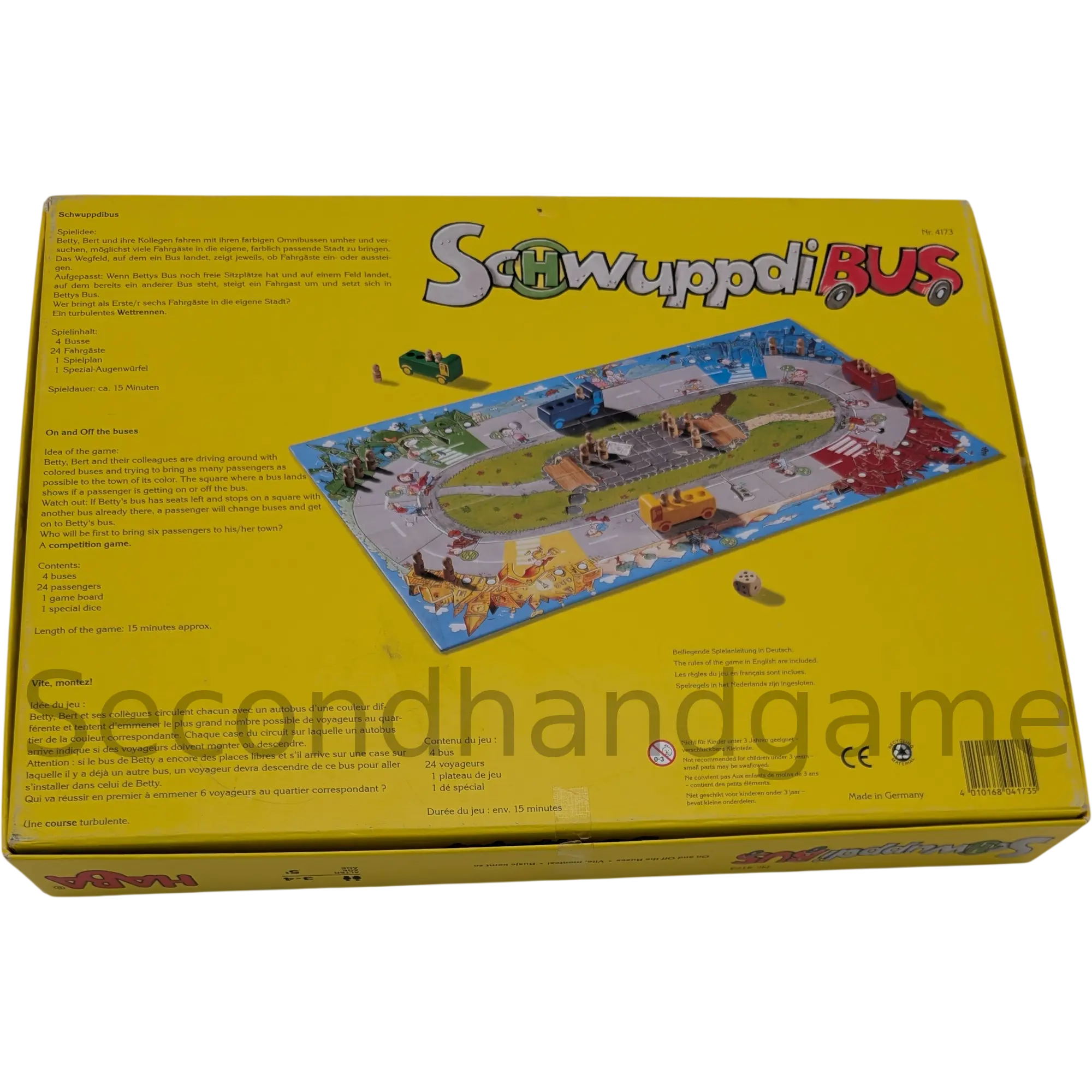 Bei HABA Schwuppdi Bus mit der Nummer 4173 steigen alle ein! In diesem lustigen Zuordnungsspiel dreht sich alles um den bunten Bus und seine Fahrgäste. Die Spieler begleiten den Busfahrer auf seiner Tour und helfen dabei, die richtigen Passagiere an den Haltestellen aufzusammeln.