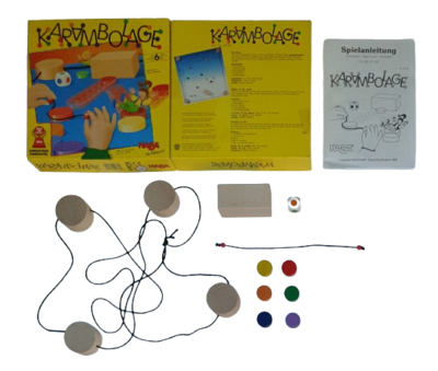 HABA Karambolage ist ein spannendes Geschicklichkeitsspiel für 2-4 Spieler ab 6 Jahren. Ziel ist es, mit einer Schussschnur die farbigen Holzscheiben so gegeneinander zu schnippen, dass sie sich berühren (karambolieren). Die Farben der Scheiben, die getroffen werden sollen, werden durch Würfel vorgegeben. Gelingt ein Treffer, gibt es Punkte. Geübte Spieler können auch den mitgelieferten Bandenstein nutzen, um unvorteilhaft liegende Scheiben zu erreichen. Wer zuerst eine vorher festgelegte Punktzahl erreicht, gewinnt.