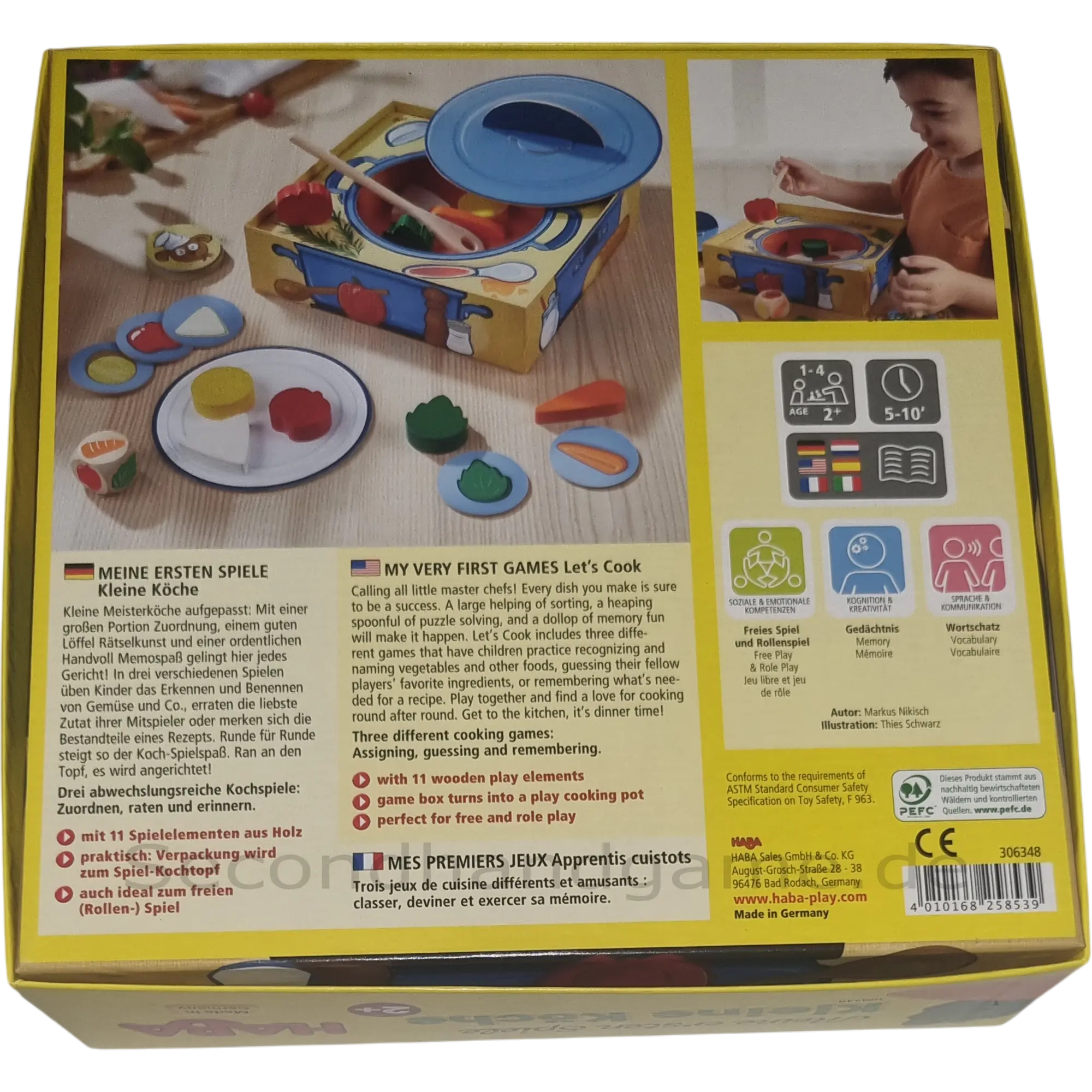 Haba Meine ersten Spiele Kleine Köche (Artikelnummer 306348) ist ein liebevoll gestaltetes Kinderspiel für 2 bis 4 Spieler ab 2 Jahren. In diesem Spiel schlüpfen die Kleinsten in die Rolle von "Kleinen Köchen" und bereiten gemeinsam ein köstliches Gericht zu. Das Spiel enthält einfache Spielregeln und große, kindgerechte Spielmaterialien. Es fördert das freie Spielen, das Benennen von Lebensmitteln, die Feinmotorik und das Verständnis für erste Spielabläufe.