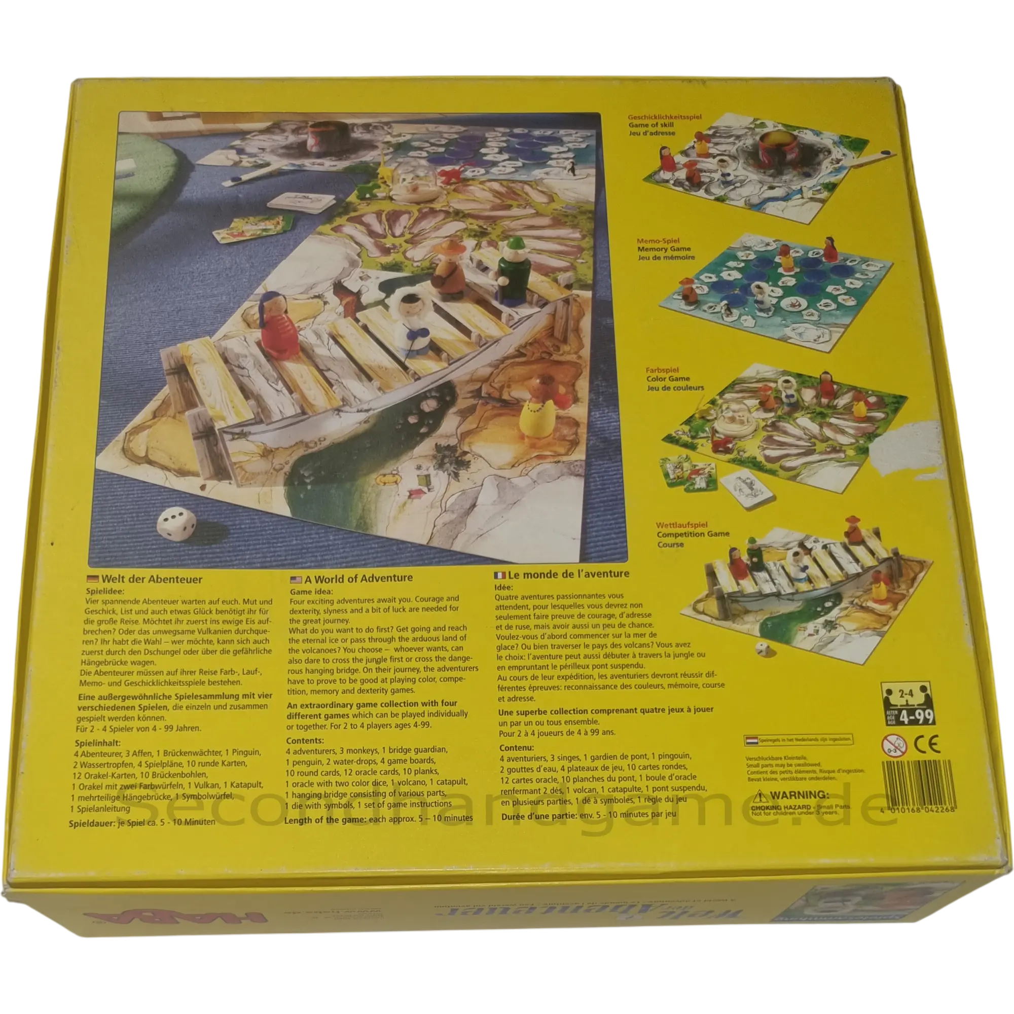 Die Haba Welt der Abenteuer (4226) ist eine abwechslungsreiche Spielesammlung für 2 bis 4 Spieler ab 4 Jahren. Sie beinhaltet vier spannende Spiele rund um das Thema Abenteuer: eine Dschungelreise, eine Antarktisexpedition, die Überquerung gefährlicher Schluchten und einen Besuch bei brodelnden Vulkanen. Die farbenfrohen Spielpläne und liebevoll gestalteten Holzfiguren laden zu aufregenden Expeditionen ein. Wer erreicht als Erster das sichere Lager? Die Spielesammlung fördert das Erkennen und Benennen von Farben, das Gedächtnis, die Feinmotorik und das Reaktionsvermögen.