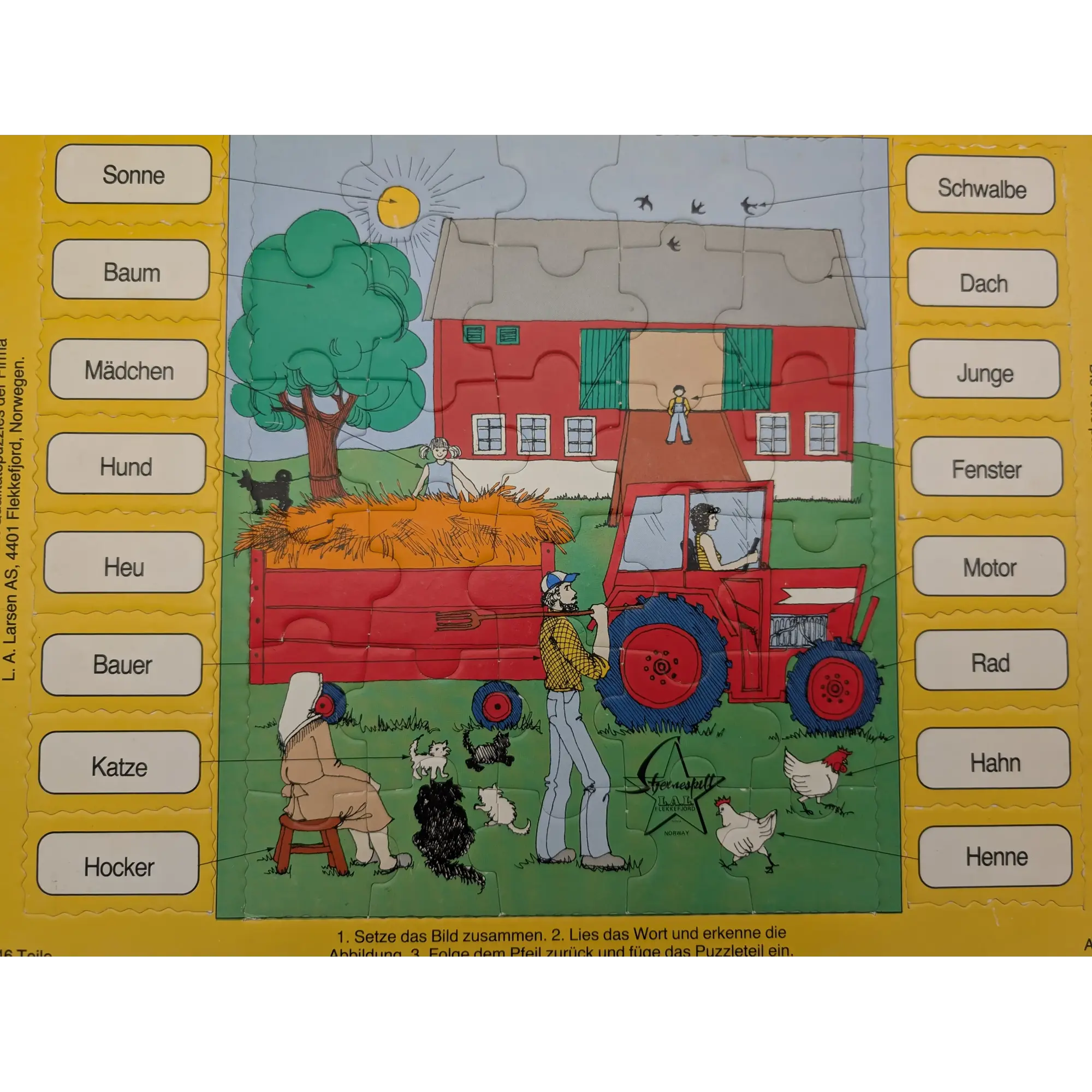 Wunderschönes 46-Teile Puzzle von L. A. Larsen mit dem Motiv Lesen und Erkennen auf dem Bauernhof.