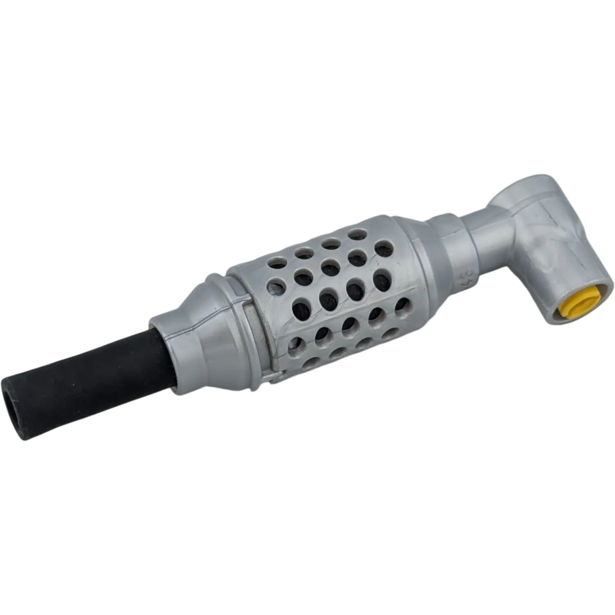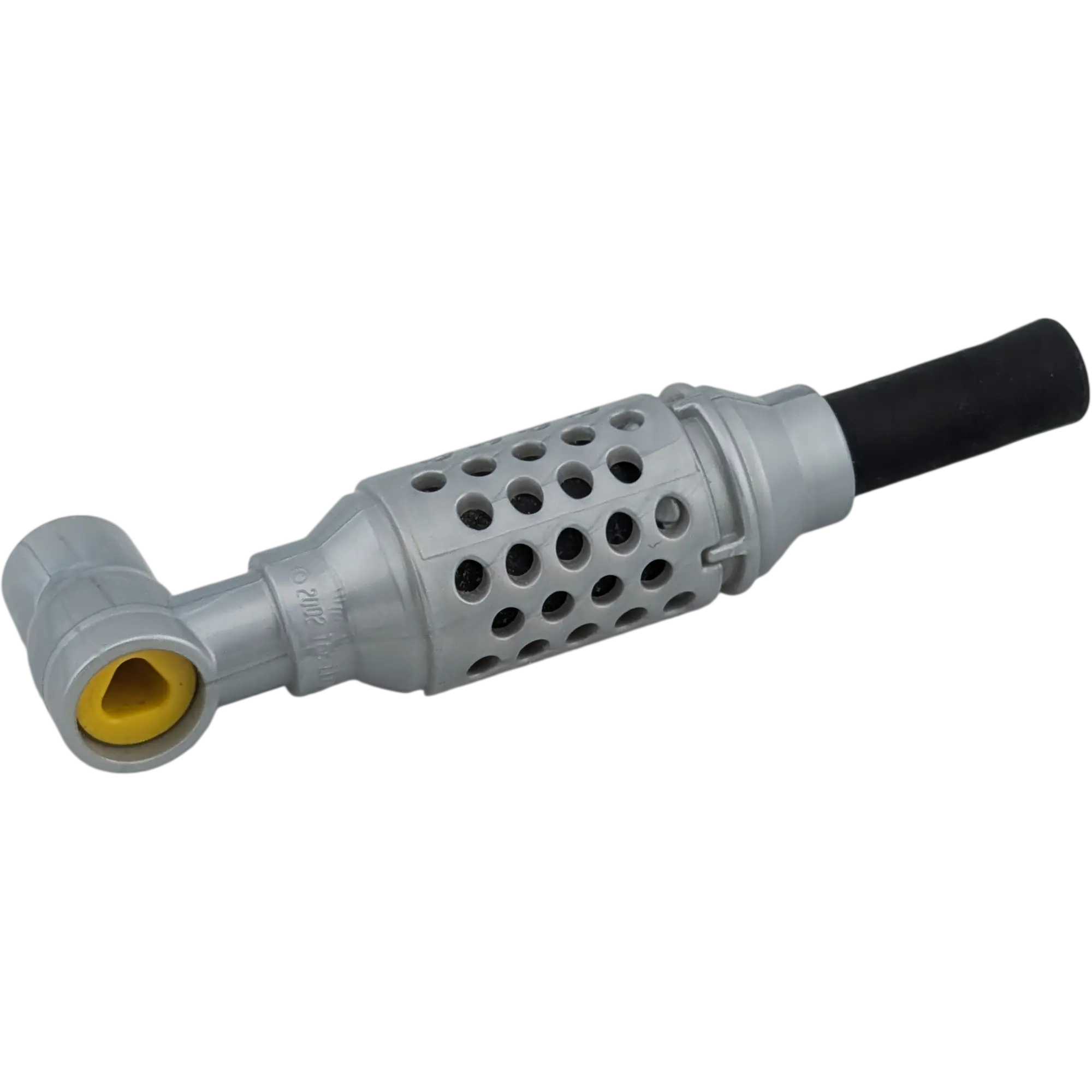 Authentisches Design: Das Teil ist in einem technischen Silbergrau gehalten und verfügt über eine markante schwarze Kappe am oberen Ende. Die geriffelte Struktur verleiht ihm einen realistischen Industrie-Look.