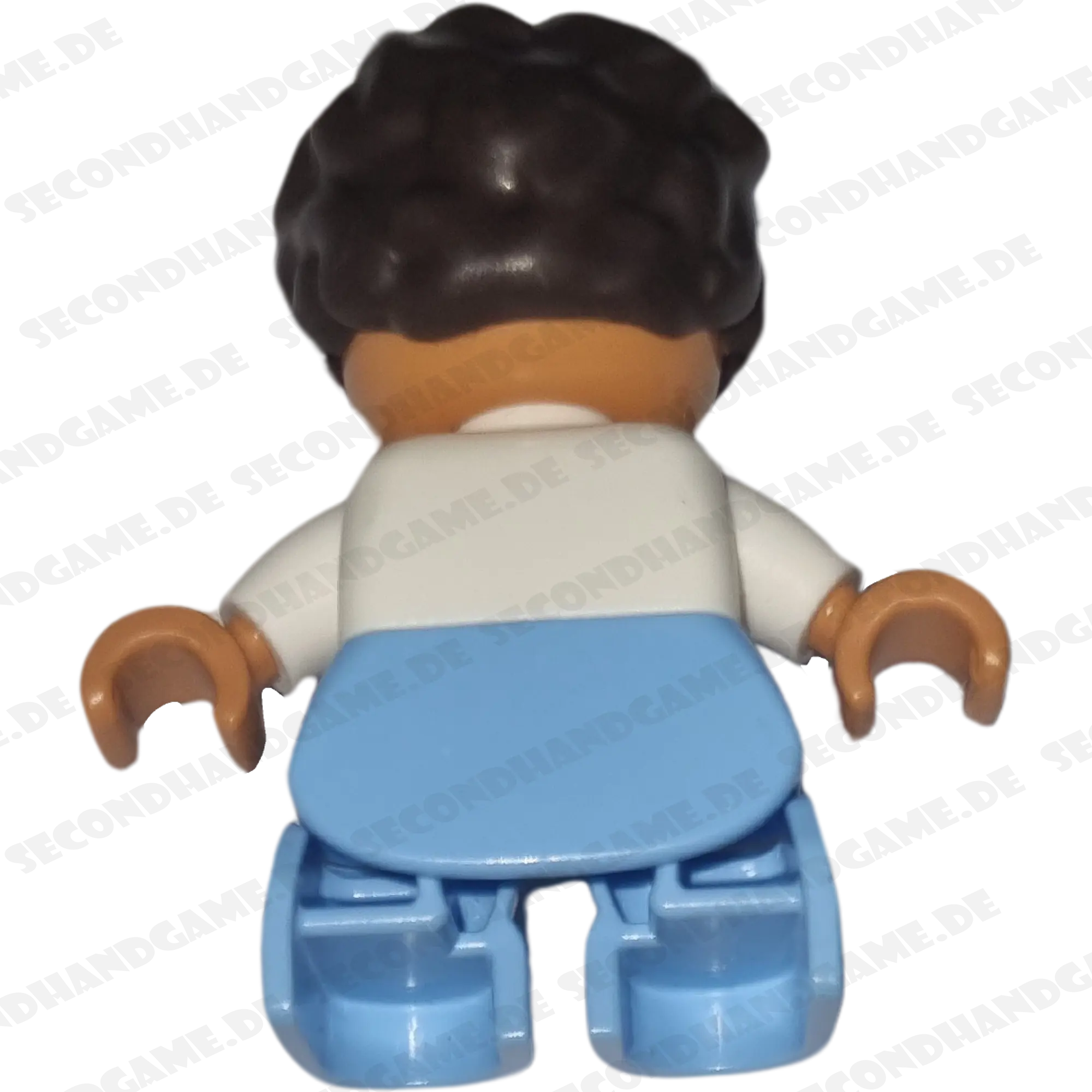 Entdecken Sie diese charmante Lego Duplo Figur, die einen Jungen darstellt. Die Figur trägt ein weißes Shirt mit hellblauen Streifen und eine passende hellblaue Hose. Mit seinen freundlichen blauen Augen und dem dunklen, wuscheligen Haar ist er eine tolle Ergänzung für jede Duplo Sammlung und regt zu fantasievollen Rollenspielen an.