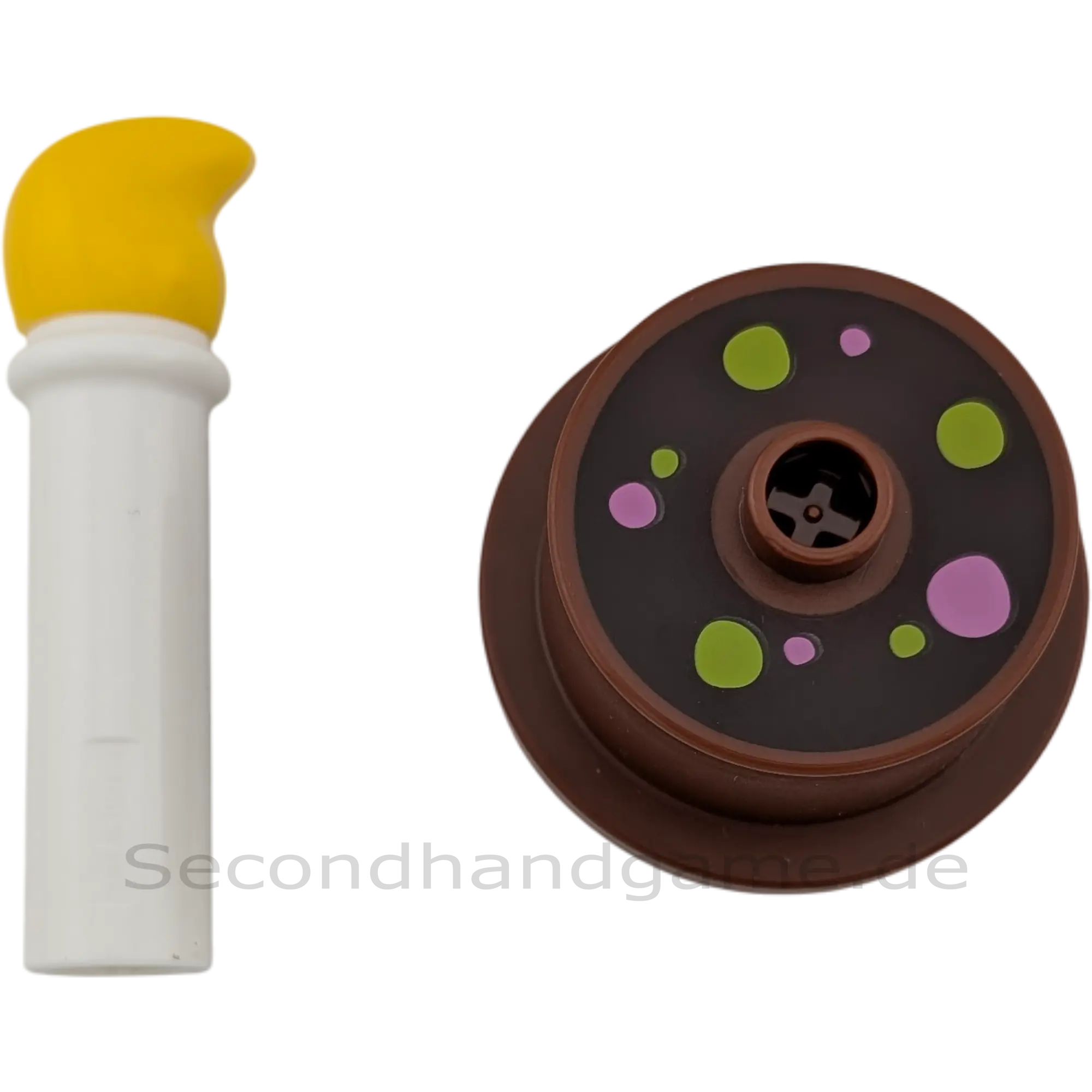 Entdecken Sie den charmanten Lego Duplo Geburtstagskuchen! Dieses zweiteilige Set besteht aus einer braunen Kuchenbasis mit einem fröhlichen Muster aus grünen und pinken Punkten und einer aufsteckbaren, zweiteiligen Kerze in Weiß mit gelber Flamme. Ein perfektes Zubehör für jede Duplo-Spielwelt und fantasievolle Geburtstagsfeiern.