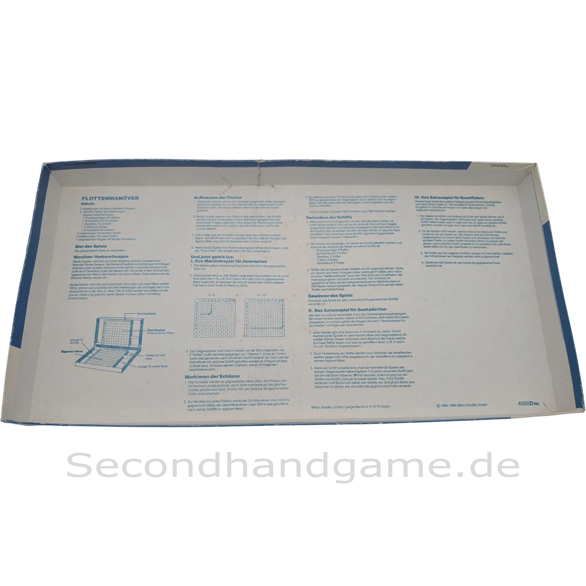 Beschreibung: Das taktische Duell MB Flottenmanöver (Art 455000) ist der ungeschlagene Klassiker unter den Zweipersonenspielen! Jeder Spieler befehligt eine Flotte und versteckt seine Schiffe auf dem Raster des Spielplans, der durch eine Sichtblende vom Gegner getrennt ist. Durch das Ansagen von Koordinaten (z. B. B5) versuchen die Spieler abwechselnd, die feindliche Flotte zu versenken. Die separate, aufklappbare Kunststoff-Spielkonsole sorgt für eine klare Organisation der eigenen Flotte und der gegnerischen Treffer. Ein fesselndes Spiel, das Logik, Taktik und Konzentration fördert.