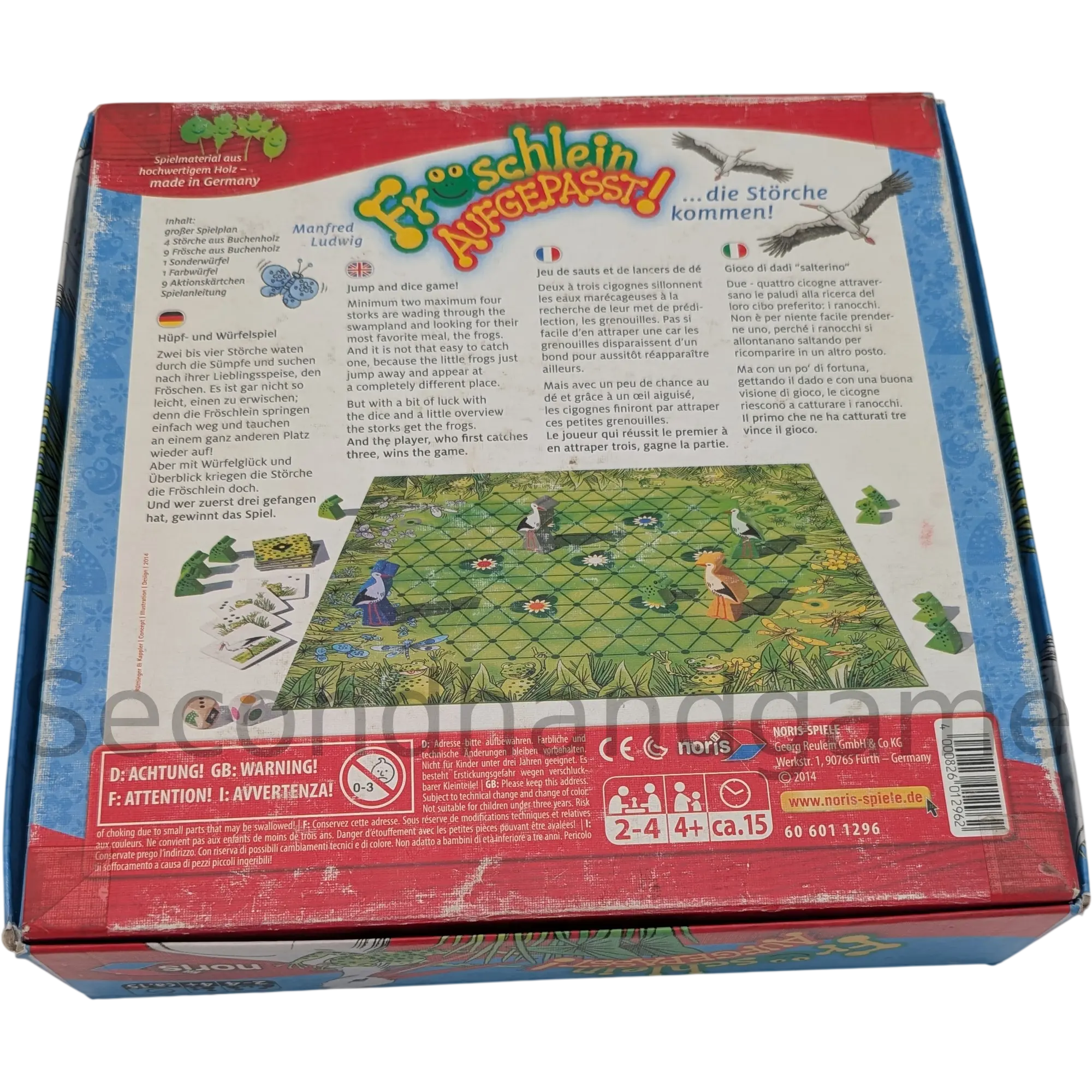 Beschreibung: Das Noris Fröschlein aufgepasst! (Ref 606013697) ist ein wunderschönes Holzspiel und ideal für Kinder ab 4 Jahren. Bei diesem fröhlichen Laufspiel versuchen die Spieler, ihre kleinen Frosch-Figuren sicher über den Teich zu manövrieren. Durch das Würfeln wird bestimmt, wie weit die Fröschlein hüpfen dürfen. Aber aufgepasst! Die Storch-Figur droht, die Frösche zu fangen. Das Spiel ist einfach und schnell zu verstehen, besteht aus hochwertigen Holzkomponenten und fördert spielerisch das Zählen und die Feinmotorik.
