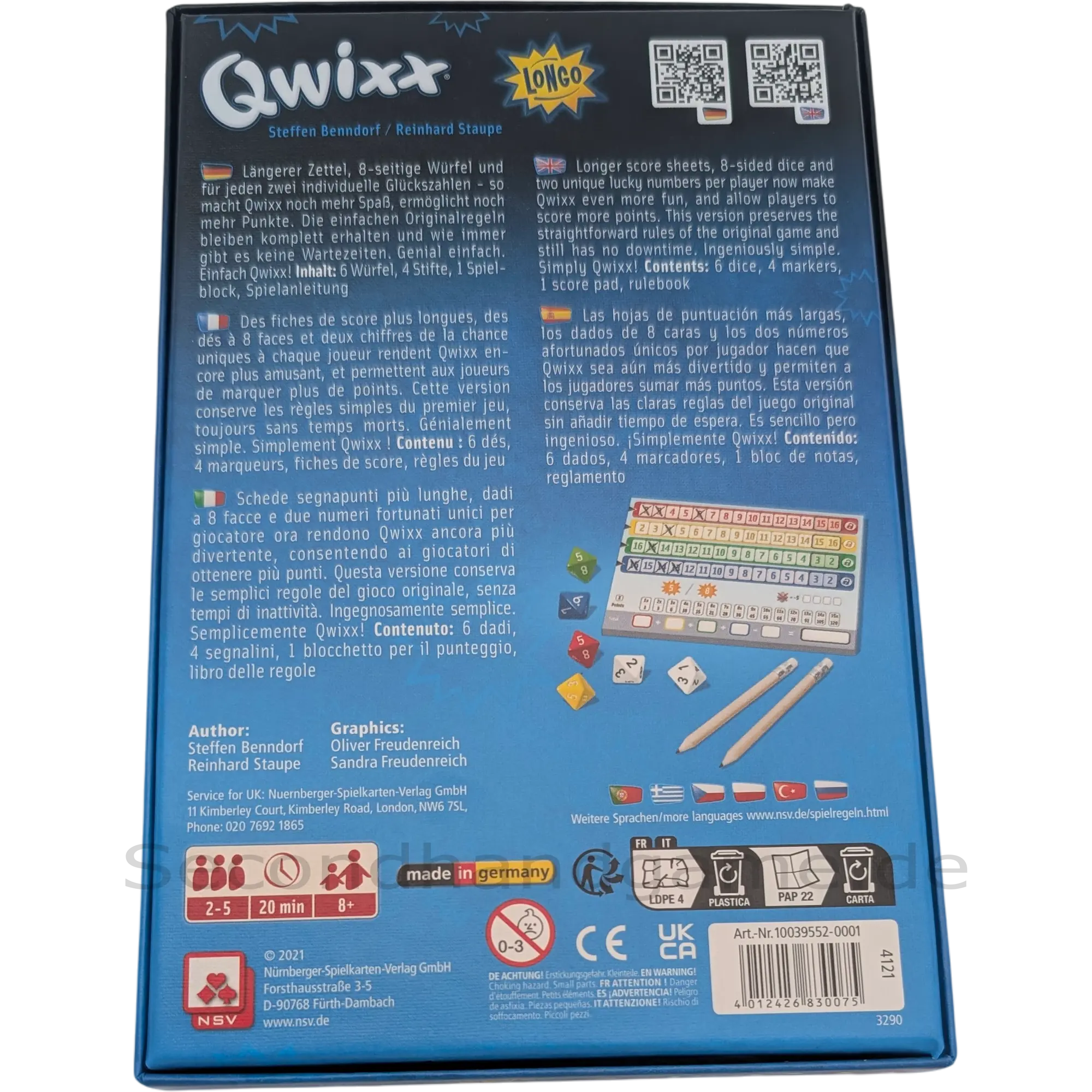 Erleben Sie mit Qwixx Longo eine spannende Erweiterung des beliebten Würfelspiels. Dank längerer Zettel, 8-seitiger Würfel und individueller Glückszahlen sind noch mehr Punkte und Spielspaß garantiert. Die genial einfachen Originalregeln bleiben erhalten, sodass es keine Wartezeiten gibt und der Spielspaß sofort beginnen kann. Ein Muss für alle Qwixx-Fans und solche, die es werden wollen!