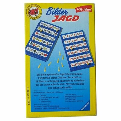 Gesagt, gemerkt, gewonnen! Bei dieser spannenden Jagd haben Gedächtniskünstler die besten Chancen. Wer schafft es, 18 Bildern nachzujagen, ohne eines zu erwischen, das der andere schon besitzt? Alternativ mit Bild oder Zahlentafel spielbar.