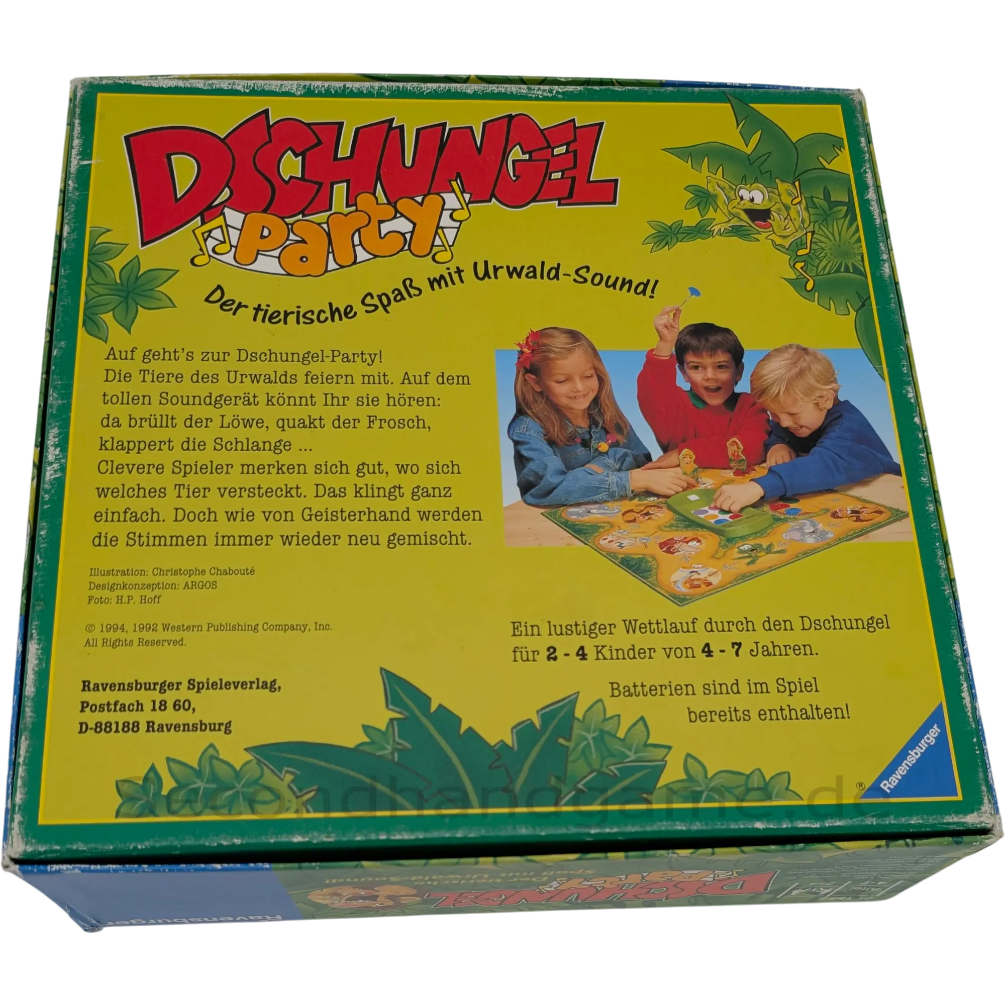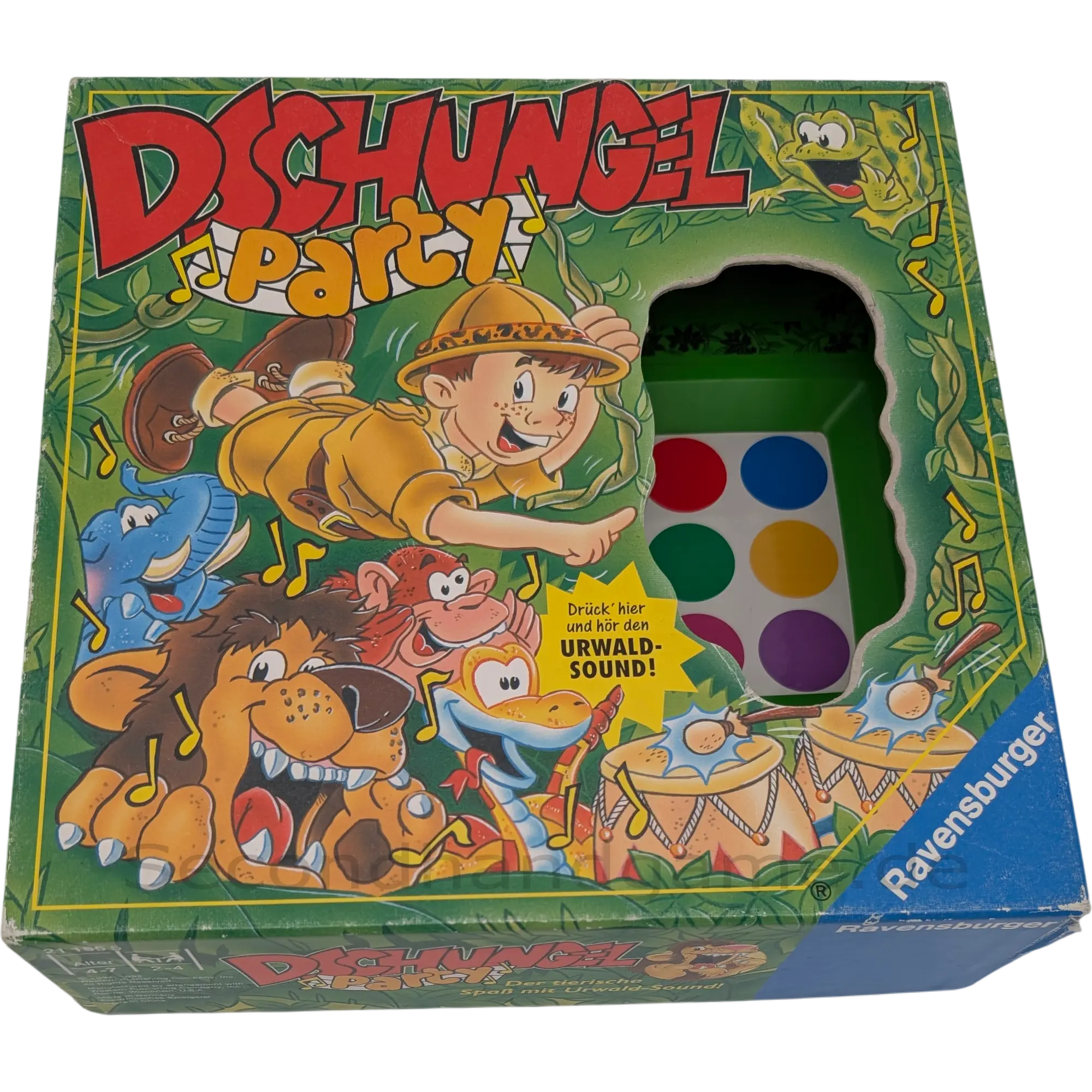 Auf geht's zur Dschungel Party! Dieses unterhaltsame Brettspiel von Ravensburger entführt die Spieler in den Urwald. Mit dem tollen Soundgerät werden die Tierstimmen lebendig: der Löwe brüllt, der Frosch quakt und die Schlange klappert. Wer sich gut merkt, wo sich welches Tier versteckt, hat die besten Chancen in diesem lustigen Wettlauf durch den Dschungel. Ein großer Spaß für die ganze Familie.