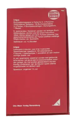 Spielziel: Durch das Legen von Wörtern auf dem Spielplan möglichst viele Punkte erzielen. Die Punktzahl hängt vom Wert der Buchstaben und dem geschickten Einsatz der Farben ab. Spielmaterial: 1 Spielplan 132 Buchstabensteine in 4 Farben 4 Buchstabenablagen 1 Wertungsblock 1 Beutel für die Buchstabensteine Spielablauf: Jeder Spieler zieht zu Beginn 12 Buchstabensteine. Der Startspieler legt sein erstes Wort (mindestens vier Buchstaben) waagerecht auf das Startfeld. Nachfolgende Wörter müssen an mindestens ein bereits liegendes Wort anschließen. Punkte werden für die gelegten Buchstaben addiert. Farbwörter (Wörter, die komplett aus Buchstaben einer Farbe bestehen) bringen zusätzliche Sonderpunkte. Es gibt auch Asse (wenn ein Buchstabe auf einem Feld der gleichen Farbe liegt), die im Spielverlauf zu Punktemultiplikatoren führen können. Spielende: Das Spiel endet, sobald ein Spieler mit einem neuen Wort eines der Zielfelder auf dem Spielplan erreicht. Gewinner ist, wer die meisten Punkte erzielt hat.Die Casino Serie von Ravensburger zeichnete sich durch eine besonders hochwertige Ausstattung aus.