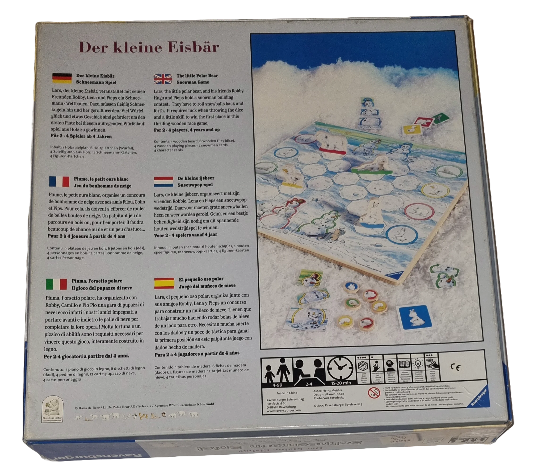Lars, der kleine Eisbär, veranstaltet mit seinen Freunden Robby, Lena und Pieps ein Schneemann - Wettbauen. Dazu müssen fleißig Schneekugeln hin und her gerollt werden. Viel Würfelglück und etwas Geschick sind gefordert um den ersten Platz bei diesem aufregenden Würfellaufspiel aus Holz zu gewinnen.