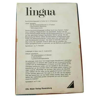 Es handelt sich um die Ausgabe von 1976. Dieses Buchstabenlegespiel eröffnet durch das Element Farbe neue, vielfältige Möglichkeiten der Spieltaktik. Ähnlich wie bei einem Kreuzworträtsel werden mit den Buchstabenplättchen in 4 Farben auf den gleichfalls farbigen Spielfeldern Wörter gelegt. Bei der Bewertung der Wörter zählen die Buchstaben entsprechend ihrer Frabe, mit übereinstimmenden Farben kann man ausßerdem wertvolle Sonderpunkte erlangen. Das Spiel ist beendet, wenn ein Wort eines der Zielfelder erreicht. Wird man es schaffen, bis dahin genügend Punkte zu sammeln, um die Wertung zu gewinnen?