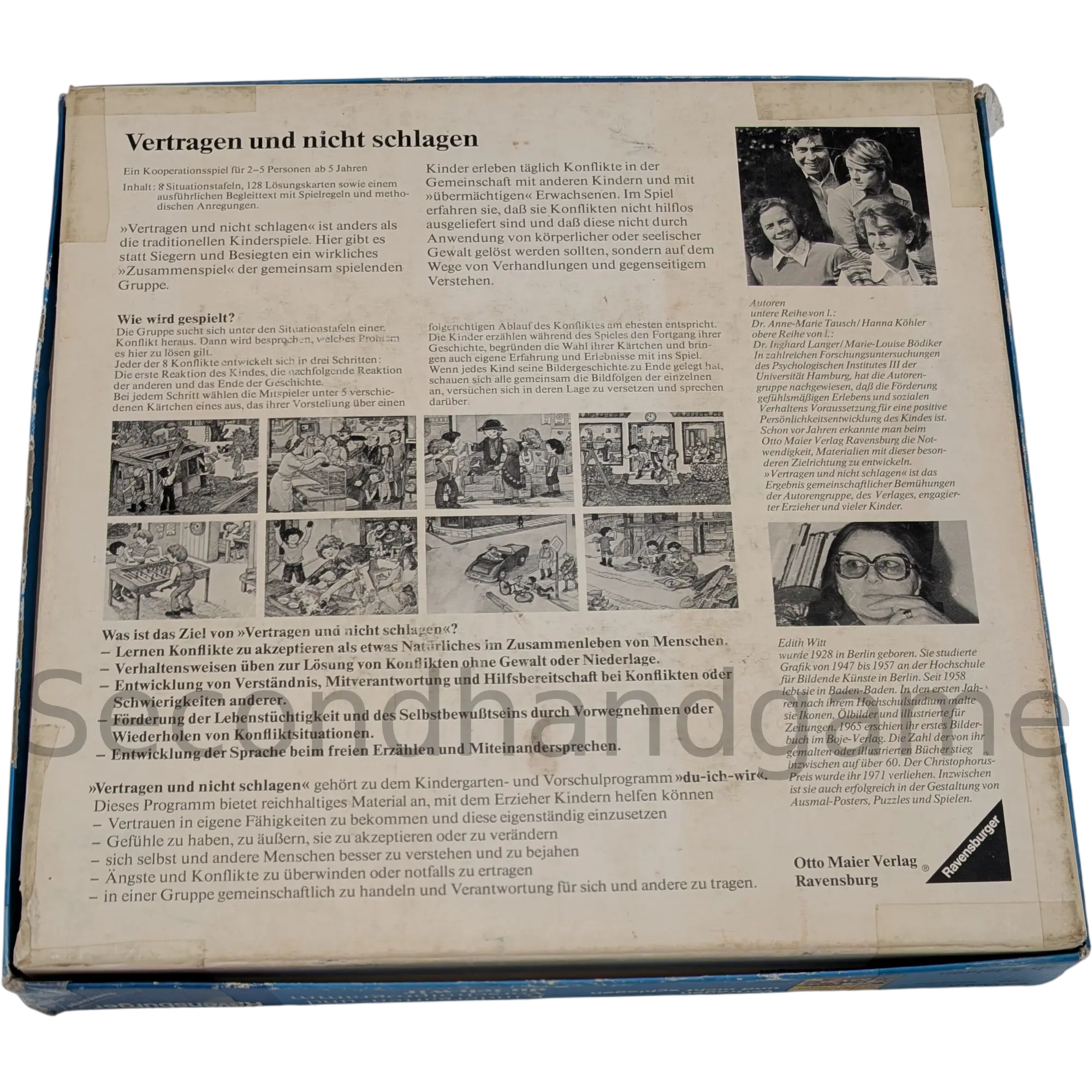 Besonderheit: Ein wegweisendes Spiel aus der pädagogischen du-ich-wir-Serie. Es dient der Gewaltprävention und dem Erlernen von Konfliktlösungen. Anstatt gegeneinander zu spielen, müssen die Kinder gemeinsam Lösungen finden. Ein gesuchtes Sammlerstück für Pädagogen und Liebhaber historischer Lernspiele.
