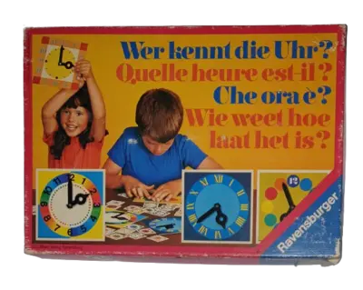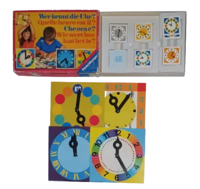 Enthält vier große, bunte Uhren mit beweglichen Zeigern! Spiel von 1977