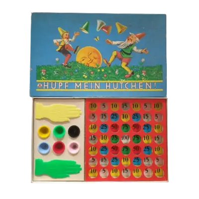 Das beliebte Geschicklichkeitsspiel für die ganze Familie! Mut zum Hut! Mit schnellen Augen und flinken Fingern gilt es, die bunten Hütchen von der richtigen Entfernung aus in die Lochplatte zu katapultieren. Ob 10 oder 200 Punkte, mit diesem lustigen Gechsicklichkeitsspiel landet man in jedem Fall einen Treffer. Sehr alt
