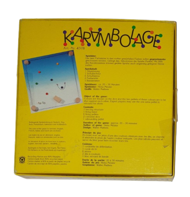 HABA Karambolage ist ein spannendes Geschicklichkeitsspiel für 2-4 Spieler ab 6 Jahren. Ziel ist es, mit einer Schussschnur die farbigen Holzscheiben so gegeneinander zu schnippen, dass sie sich berühren (karambolieren). Die Farben der Scheiben, die getroffen werden sollen, werden durch Würfel vorgegeben. Gelingt ein Treffer, gibt es Punkte. Geübte Spieler können auch den mitgelieferten Bandenstein nutzen, um unvorteilhaft liegende Scheiben zu erreichen. Wer zuerst eine vorher festgelegte Punktzahl erreicht, gewinnt.