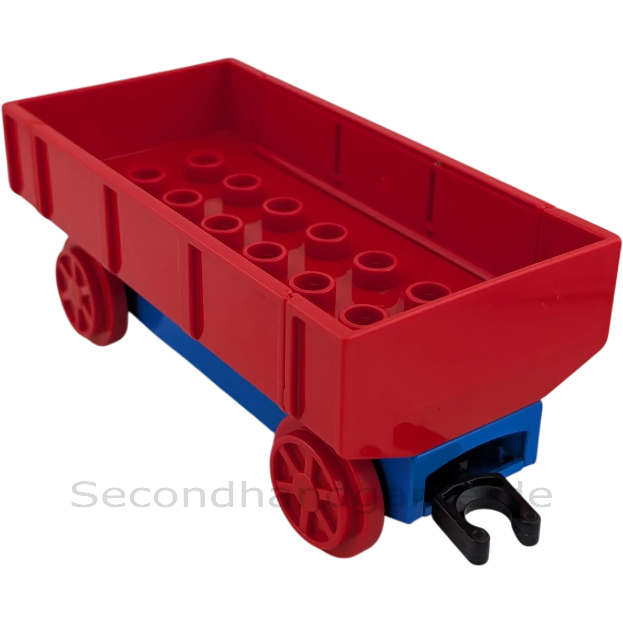 Besonderheit: Kurzer Güterwagen (meist 8 Noppen lang) für die Duplo Eisenbahn. Der Wagenkasten ist Blau und die Räder sind Rot. Mit Magnetkupplung.