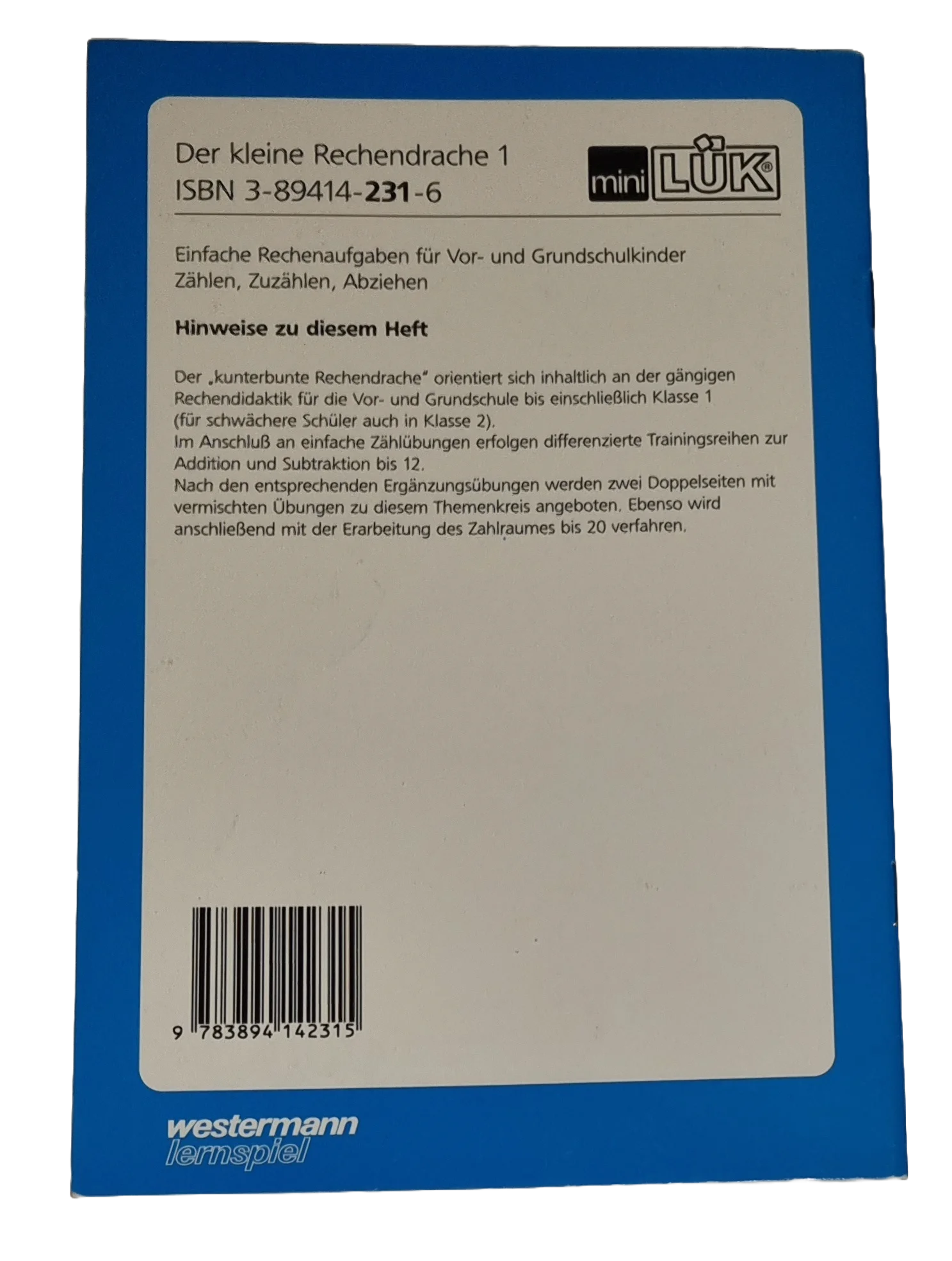 Das "Mini Lük Heft Der kleine Rechendrache 1 Einfache Rechenaufgaben für Vor- und Grundschulkinder" ist ein ideales Übungsheft aus dem Mini Lük-System für Vor- und Grundschulkinder. Es bietet einfache Rechenaufgaben und ist der erste Teil der Reihe "Der kleine Rechendrache". Spielerisch werden grundlegende mathematische Konzepte vermittelt, um den Kindern den Einstieg ins Rechnen zu erleichtern. Dank des selbstkontrollierenden Mini Lük-Systems können die Kinder ihre Ergebnisse selbstständig überprüfen und mit dem kleinen Rechendrachen auf eine spannende Entdeckungsreise durch die Welt der Zahlen gehen.