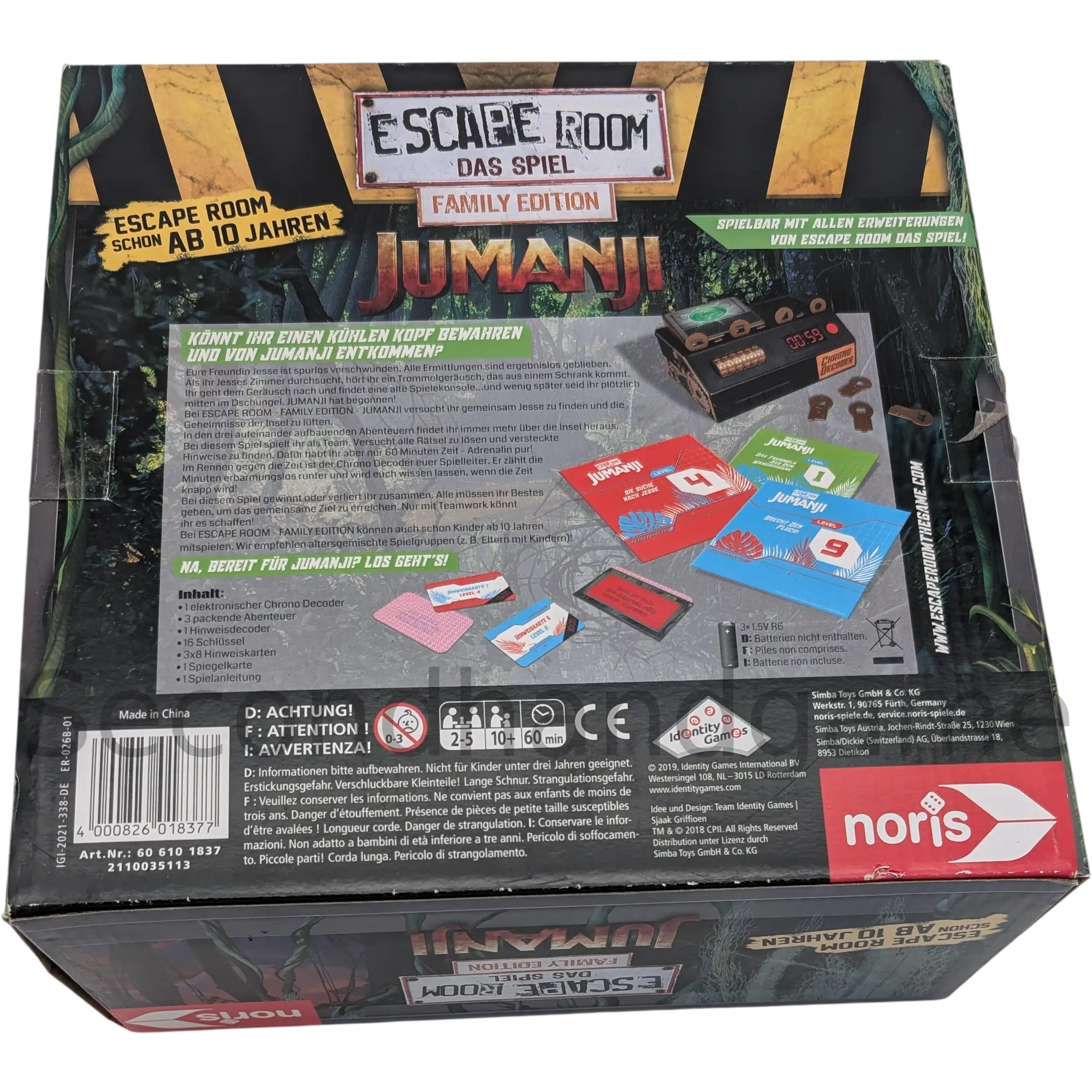 Beschreibung: Die Noris Escape Room Das Spiel Family Edition Jumanji (Ref 606018318) nimmt 2 bis 5 Spieler ab 10 Jahren mit auf ein wildes Abenteuer. Tauchen Sie in die faszinierende Welt des Jumanji-Films ein und erleben Sie in mehreren Szenarien den Nervenkitzel eines Escape Rooms direkt zu Hause! Nur durch Teamwork, logisches Denken und schnelles Kombinieren können die Spieler die kniffligen Rätsel lösen, Codes knacken und die Gefahren des Dschungels besiegen. Die Family Edition ist perfekt für einen spannenden, gemeinsamen Spieleabend mit älteren Kindern geeignet.