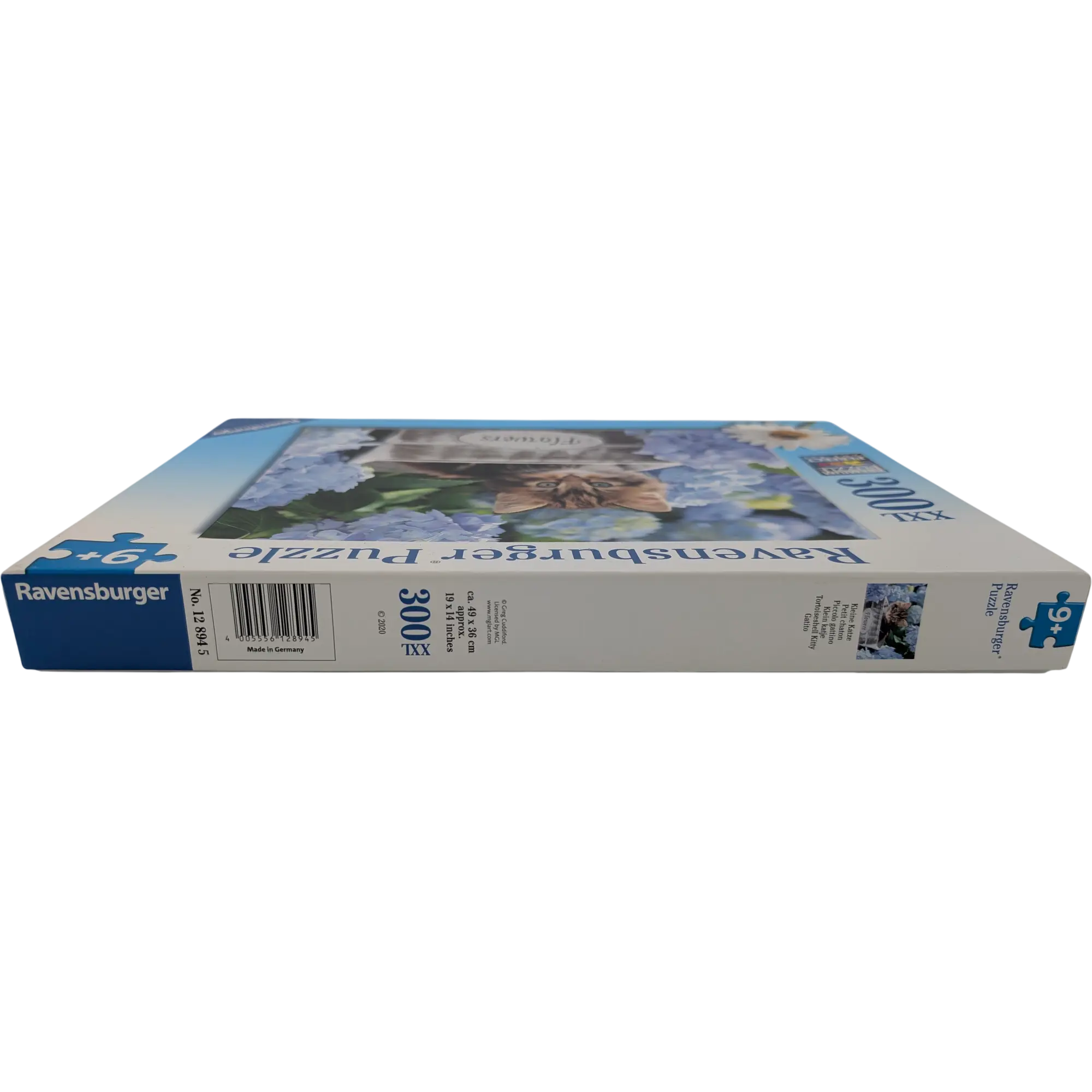 Wunderschönes 300-Teile Puzzle von Ravensburger mit dem Motiv ein kleines, getigertes Kätzchen in einer weißen Holzkiste mit blauen Hortensienblüten.